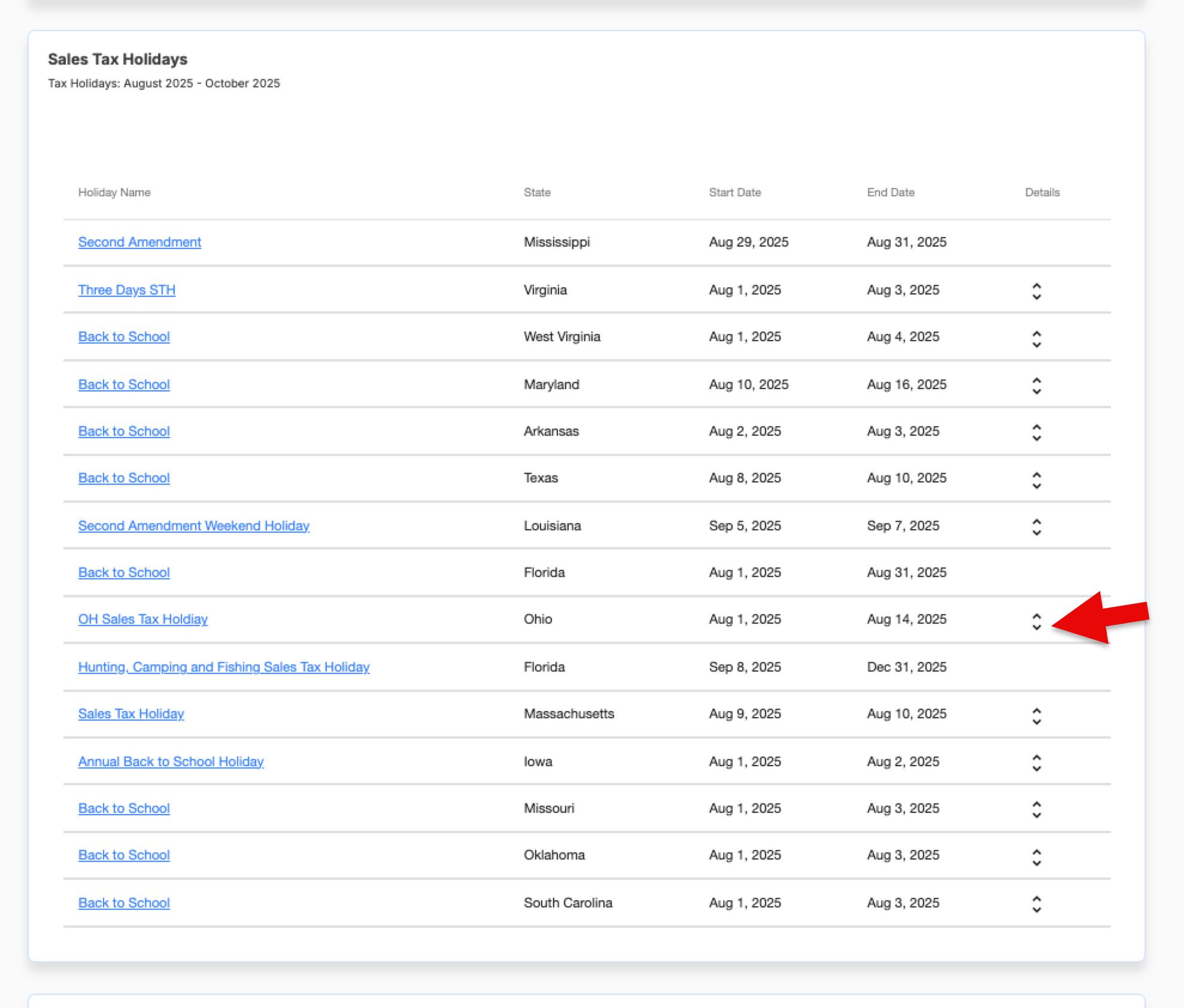 - Click the down arrow next to any listed holiday to view the TICs eligible for tax-free or reduced rates in that state.