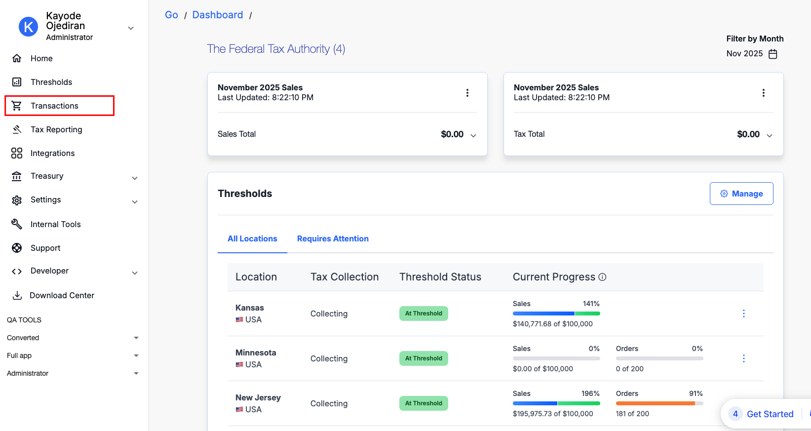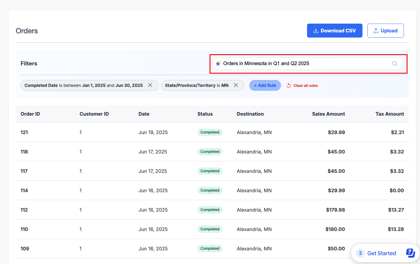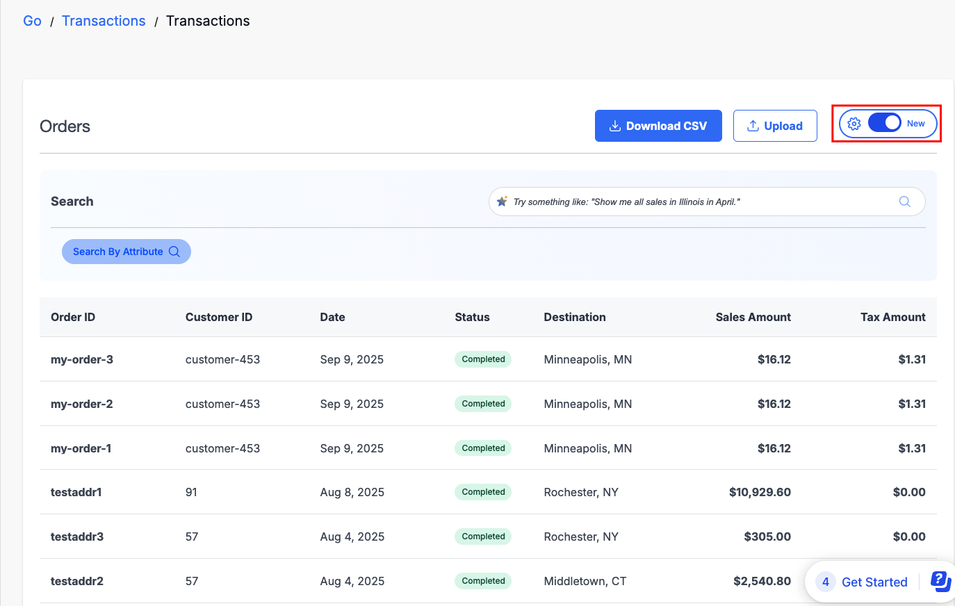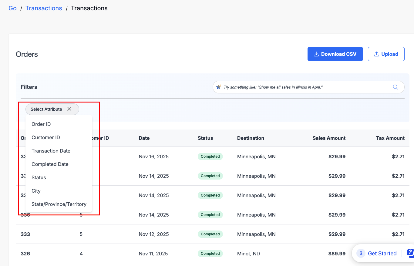 The Transactions page brings all of your order activity into one place, giving you the tools to search, filter, and analyze transactions with precision. By combining AI-powered search, flexible filters, detailed transaction views, and export options, it equips you to stay on top of sales tax compliance and maintain accurate records. When reconciling reports, validating tax collection, or resolving order-level questions, you obtain the clarity and control you need to manage your sales with confidence.