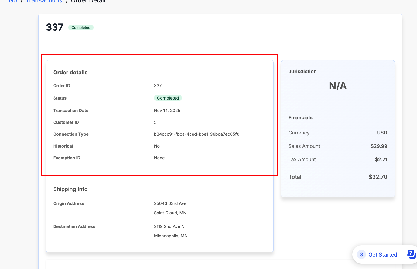 At the top of the page, you’ll find the core order information, including the Order ID and its current status (for example: Captured, Recalculated, or Not Collected). Additional metadata such as the transaction date, completed Date, customer ID, and the connection ID used to process the order are also displayed here. If the order was flagged as historical, this will be clearly marked. For tax-exempt orders, the associated exemption information and exemption ID are listed.