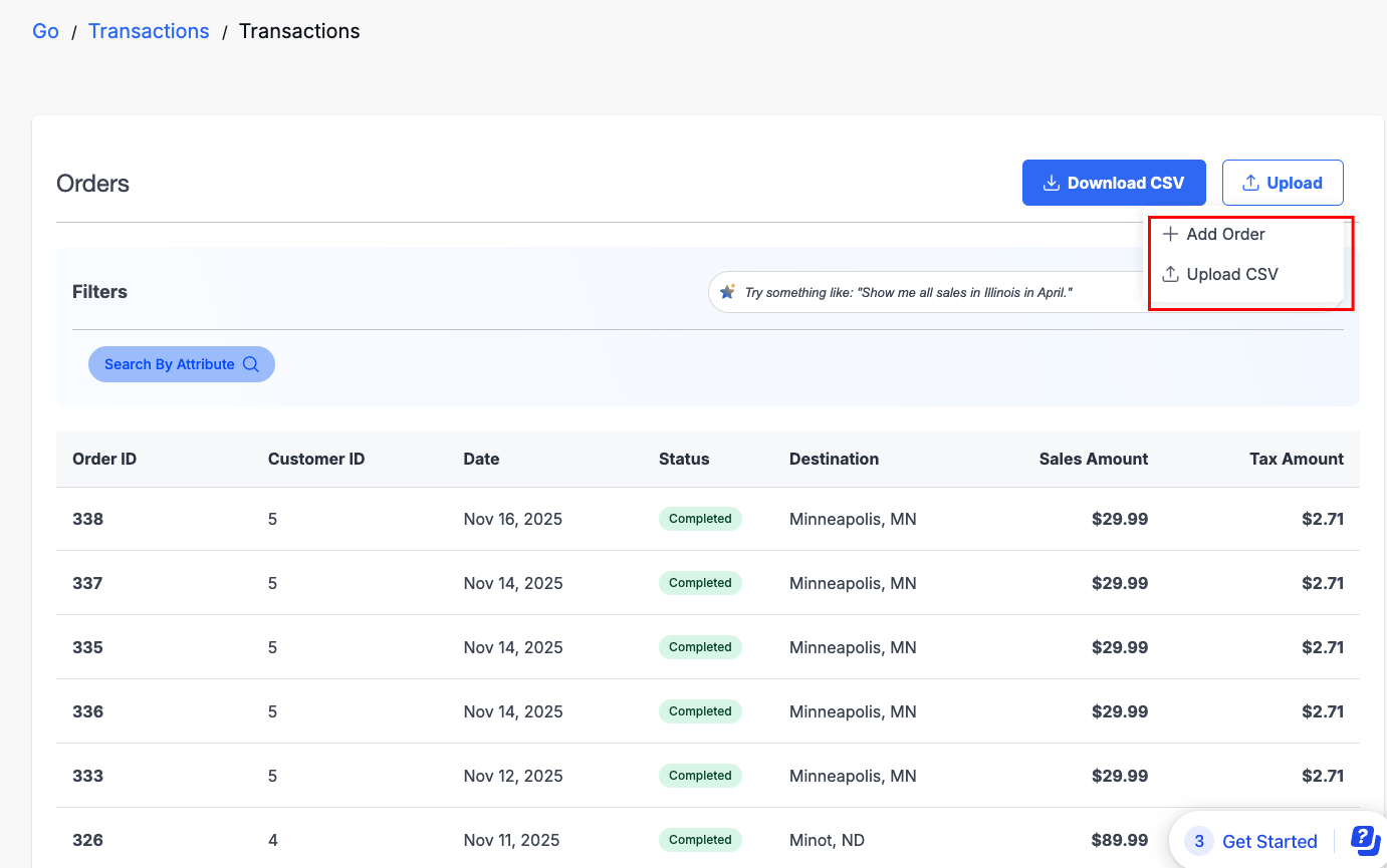 At the top of the Transactions page, you’ll find the Upload button. This button gives you two options for adding transactions to your account: uploading in bulk via a CSV file or adding an order manually. Both options are accessed through the dropdown menu on the Upload button.