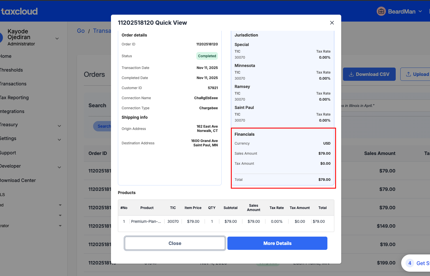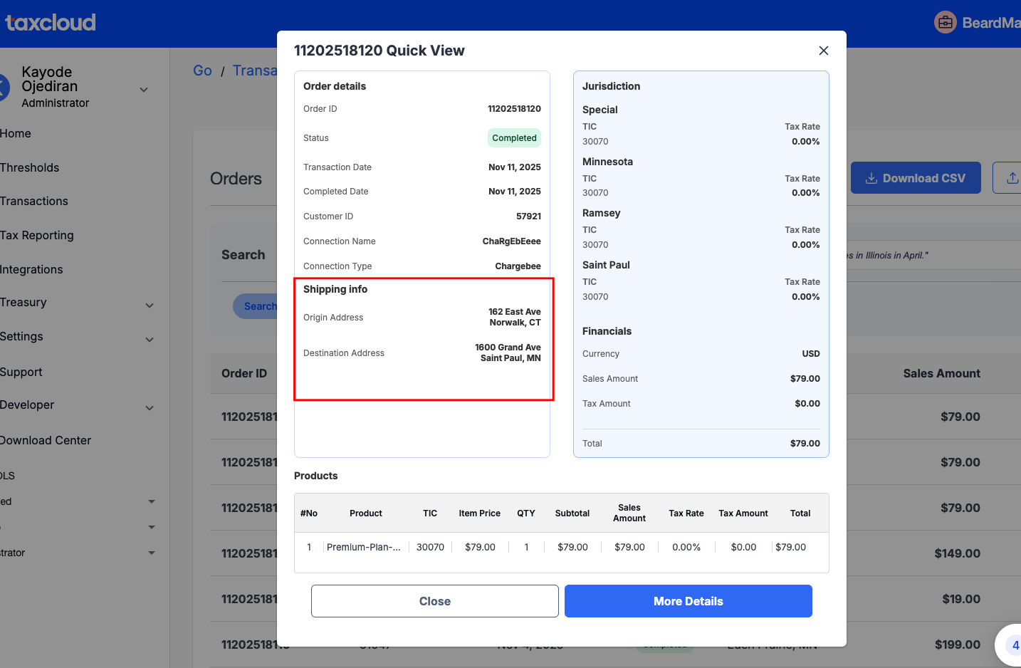 Clicking on any transaction opens the details of that transaction. This detail includes a full breakdown of the order, including order metadata, customer details, tax calculations, and line item summaries. It is designed to give merchants complete visibility into how a transaction was processed within TaxCloud.