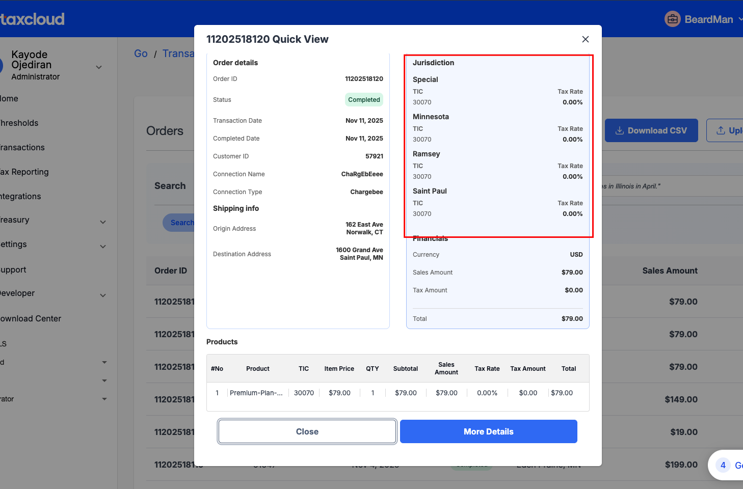 TaxCloud provides a detailed jurisdiction-level view of the transaction. Here, you’ll see which state, county, and city jurisdictions applied, along with the Taxability Information Code (TIC) for each item. The applicable tax rate and tax amount for each jurisdiction are clearly displayed, ensuring full transparency into how the tax was determined.